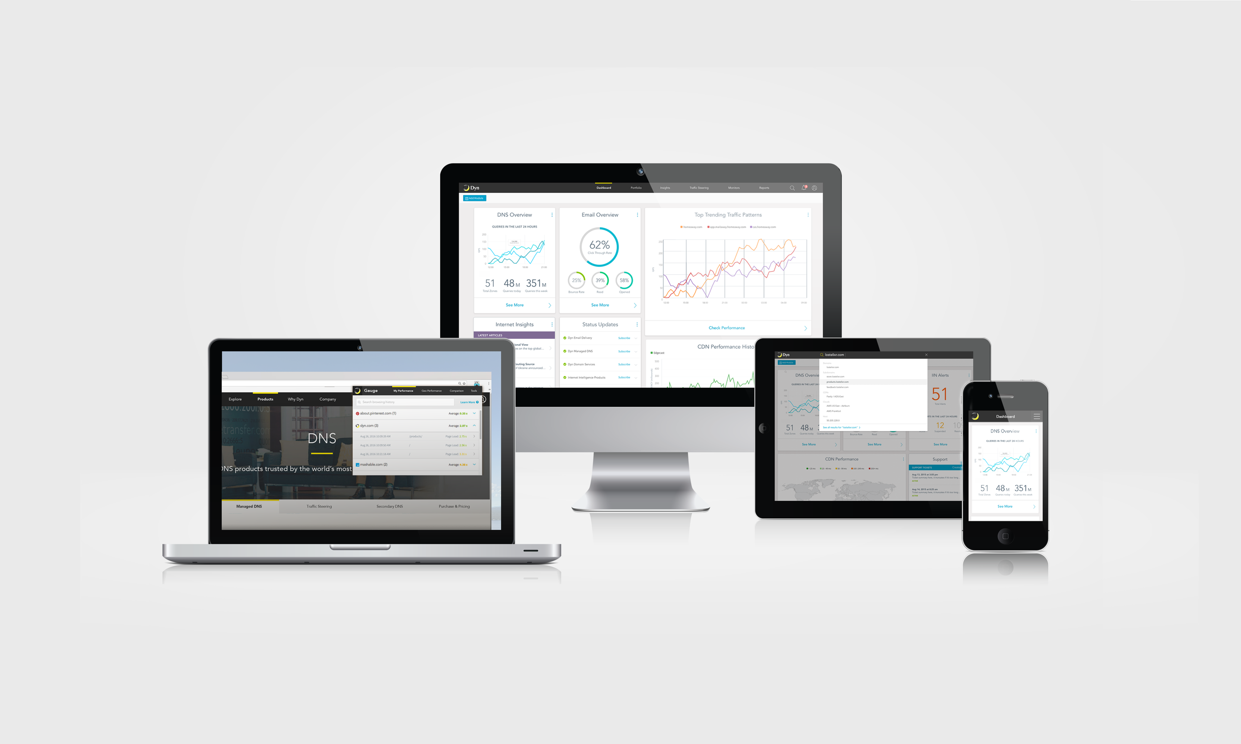 Gauge had been developed in a start-up bootstrap fashion, and needed to not only look like it came from Dyn, but to work for the average internet geek. With every tweak we made in the UI and flow, the experience exponentially improved—like adding gasoline to a fire. Gauge was the first of Dyn's UIs to take on the new style that bridged the gap between marketing and product.