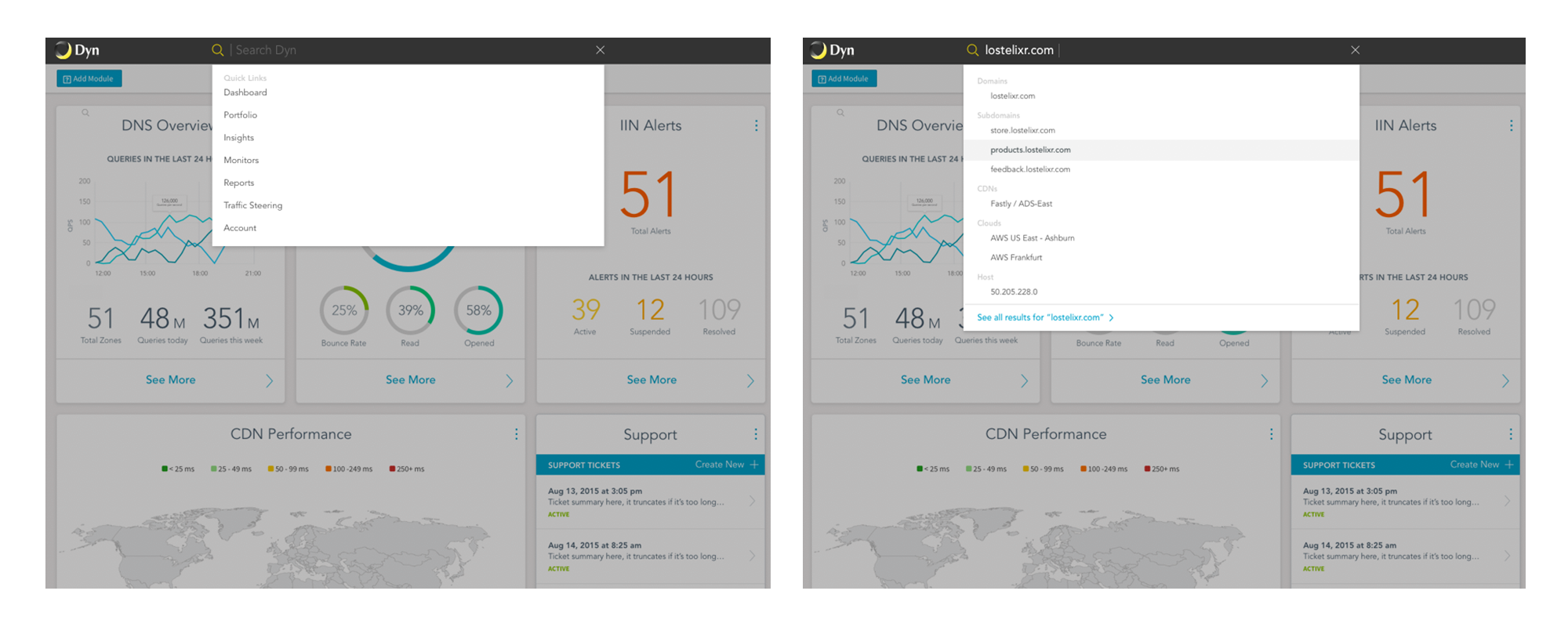 USER EXPERIENCE • PRODUCT DESIGN • USER TESTING • VISUAL DESIGNAn arising platform play meant a brand new dashboard experience for our customers. Merging our three main products into one platform, customers could discover new features, respond to alerts in real time and explore the vast amount of data collected by Dyn in useful and meaningful ways. Coming together from all points of the business—design, sales engineering, product management, engineering and customer success, we developed a dashboard with capabilities and uses our customers had never seen, creating an intersection of features that drove value and growth for the business. Designed & launched in 2016.